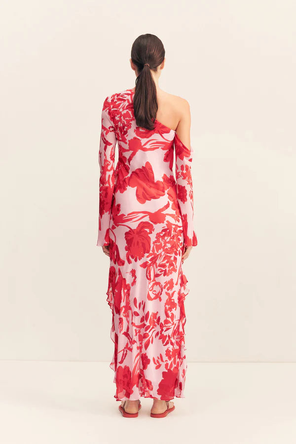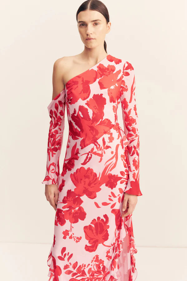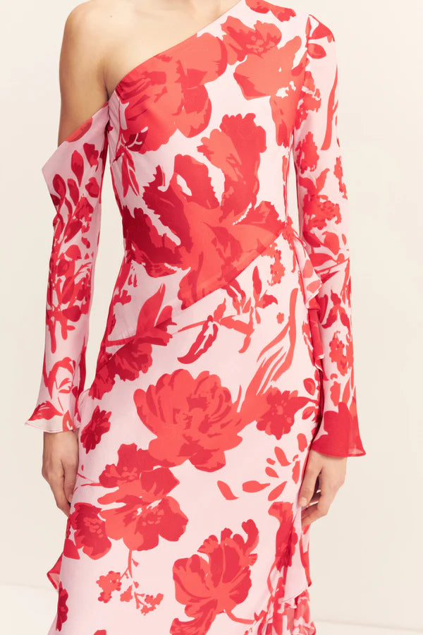 Asymmetrical long sleeve maxi dress with ruffle details in a light weight semi-sheer georgette in the geranium red print.