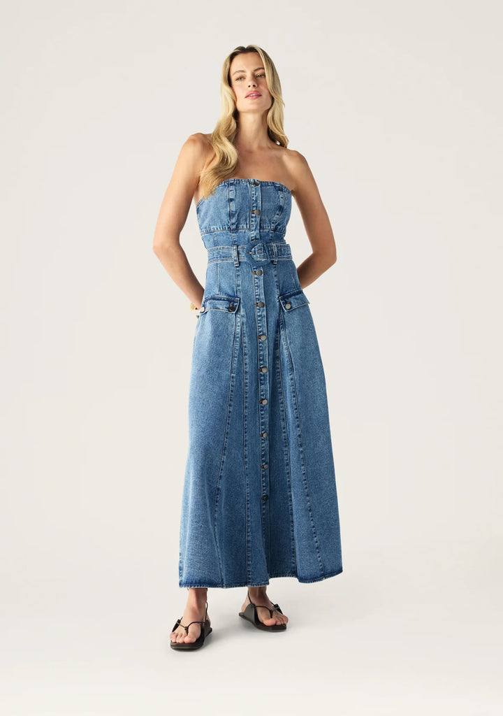 A contemporary take on a classic fabric, the Aveline Denim Strapless Dress is your effortless answer to modern feminine style. Cut from structured mid-wash denim, this piece makes a statement with its figure-accentuating bodice and full-length silhouette. A front button placket adds a utilitarian edge, while cleverly placed seam detailing flatters the form. Whether styled up with heels or down with slides, this is a piece designed to transition with ease across seasons.