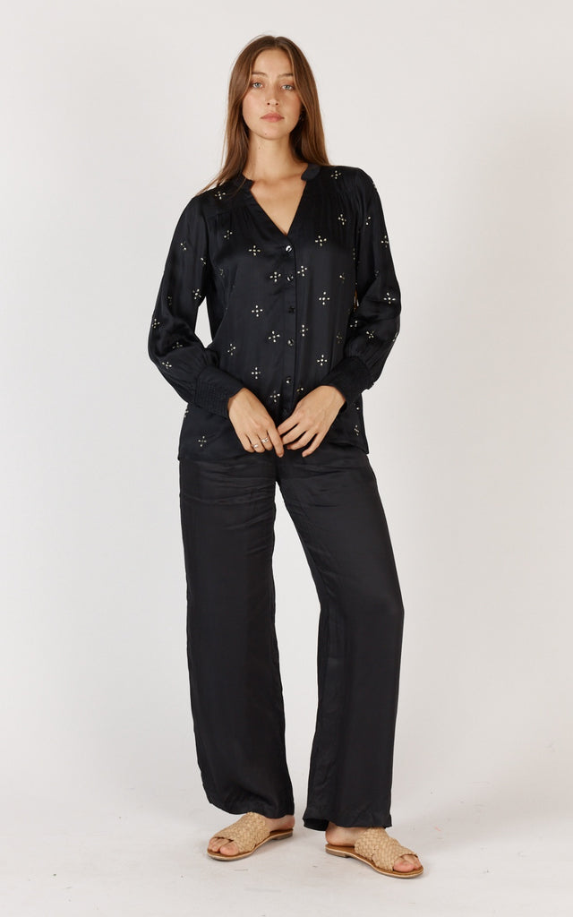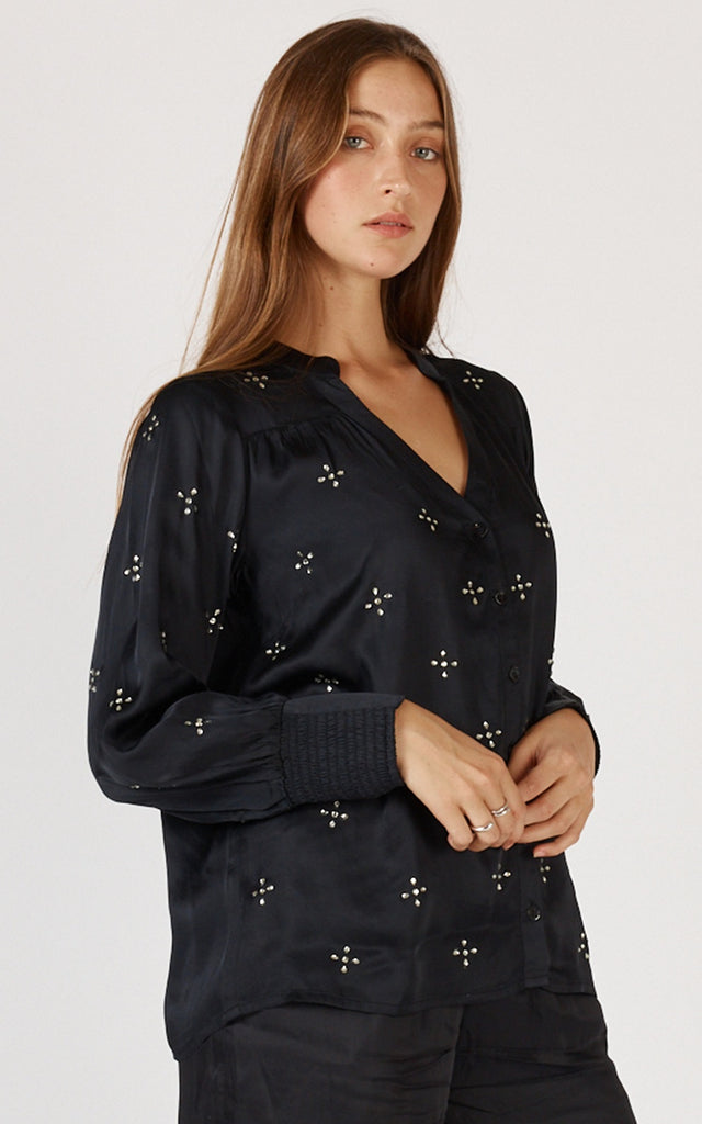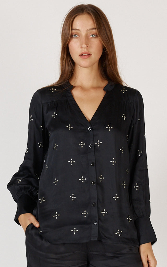 The Munchen Shirt by Ruby Yaya is crafted from a silky, lightweight fabric with a relaxed fit, a button-down front, a V-neckline, and long sleeves. Gemstone detailing elevates this classic black shirt from simple to standout.