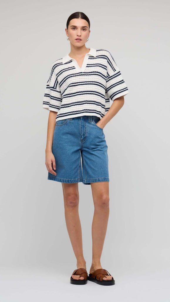The Solstice Navy & White Knit Polo Top by Staple the Label is a relaxed summer essential with a modern twist. Featuring a deep V-neckline with a soft collar, this short-sleeve knit is crafted from a breathable cotton-blend, finished with classic navy stripes on a crisp white base. Perfect for pairing with denim, tailored shorts, or layered over swimwear for effortless resort styling.