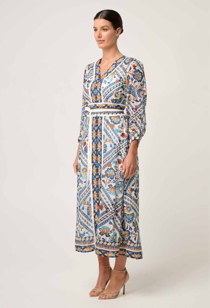 Step into effortless elegance with the Alexis Silk Cotton Midi Dress in Petinos Floros– where artisan-inspired florals meet refined modern tailoring. Crafted from a luxurious silk-cotton blend, this airy midi dress features a botanical mosaic of sun-drenched florals in hues of indigo, terracotta, and marigold. The silhouette is thoughtfully detailed with a contrast trim and a self-tie rope belt to define the waist, creating a flattering and feminine shape. Whether you're wandering a coastal town or attending a garden soirée, the Alexis dress offers the perfect balance of laid-back grace and elevated charm.