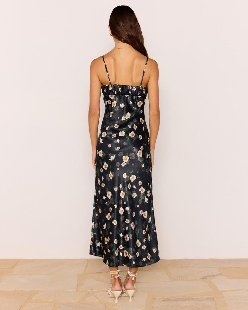 - Romantic and refined, the Elinor Black Floral Bias Midi Dress is made for every special moment. Crafted from a silky floral satin, this dress skims the body with a soft bias cut that flatters the figure. The ruched bust and keyhole tie detail add a feminine touch, while the adjustable straps ensure the perfect fit.