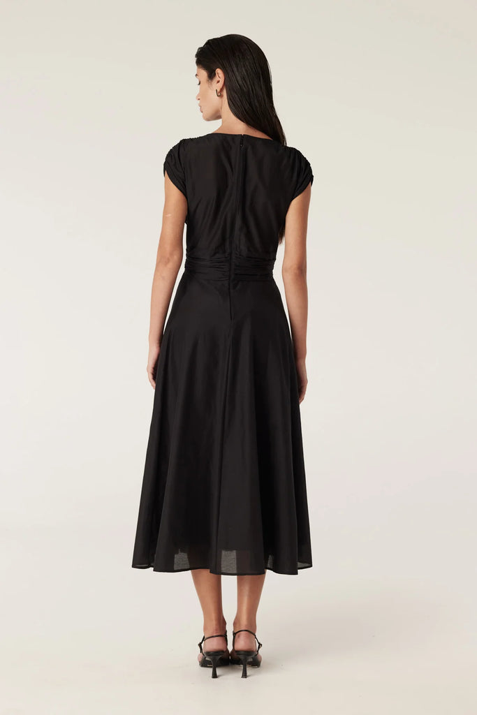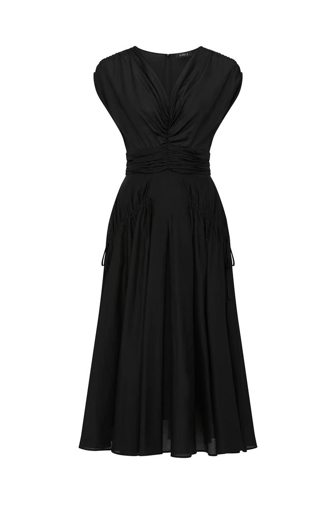 The Layla Midi Dress features a fit-and-flare silhouette with soft gathers at the front V-neck and waist. It has rouching details with ties on the low hip and an invisible back zip. Made from sheer silk / cotton voile with a cotton lining.