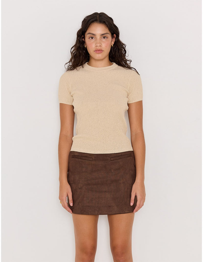 An everyday staple with a refined finish. The Apollo Rib Knit Tee is cut from a soft, lightweight knit in a neutral oat hue, offering stretch and structure for a flattering fit. With its crew neckline and short sleeves, it's the kind of elevated basic you'll wear on repeat. Kiara wears a size Small. She is 5'10", with a 32" bust, 26" waist & 37" hip.