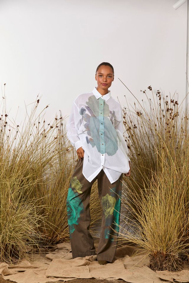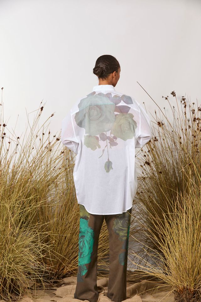 Elevate your wardrobe with Cats Meow | White by Maud Dainty, featuring oversized light cotton fabric adorned with delicate printed roses. This piece fuses art and fashion seamlessly, offering a refined yet effortless statement that enhances your style with floral elegance and breathable comfort. Perfect for those who appreciate understated sophistication in their everyday attire.