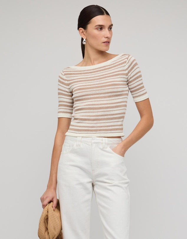 The Echo Beige & White Stripe Boat Neck Knit Top is a timeless staple with a fresh, modern feel. Made from 100% acrylic, it offers a lightweight, soft-touch knit perfect for layering or wearing solo. Featuring a classic beige and white stripe pattern, a refined boat neckline, and a fitted silhouette, this tee works effortlessly from casual days to smart-casual moments.