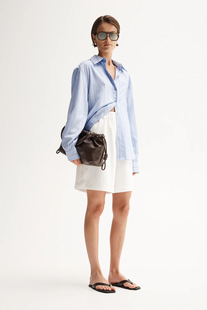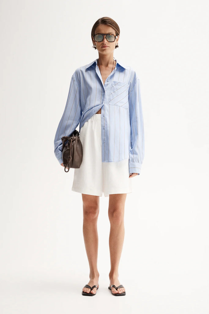 A relaxed shirting option for day to day outfitting, the Henry Stripe Shirt is made of a lightweight fabric with an accent stripe pattern. Cut to a slightly oversized fit for a masculine style edge, this shirt has a classic collared neckline, button through front, full length sleeve with button cuffs, and large patch pocket.