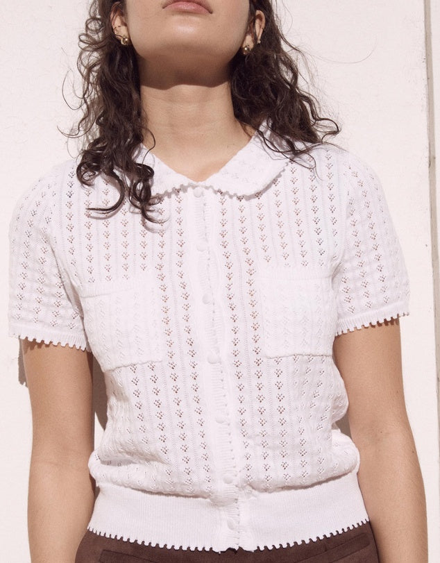 A vintage-inspired staple, this white knit tee is crafted in soft cotton with delicate pointelle detailing, scalloped trims, and a sweet Peter Pan collar. Perfect for dressing up denim or pairing with skirts.