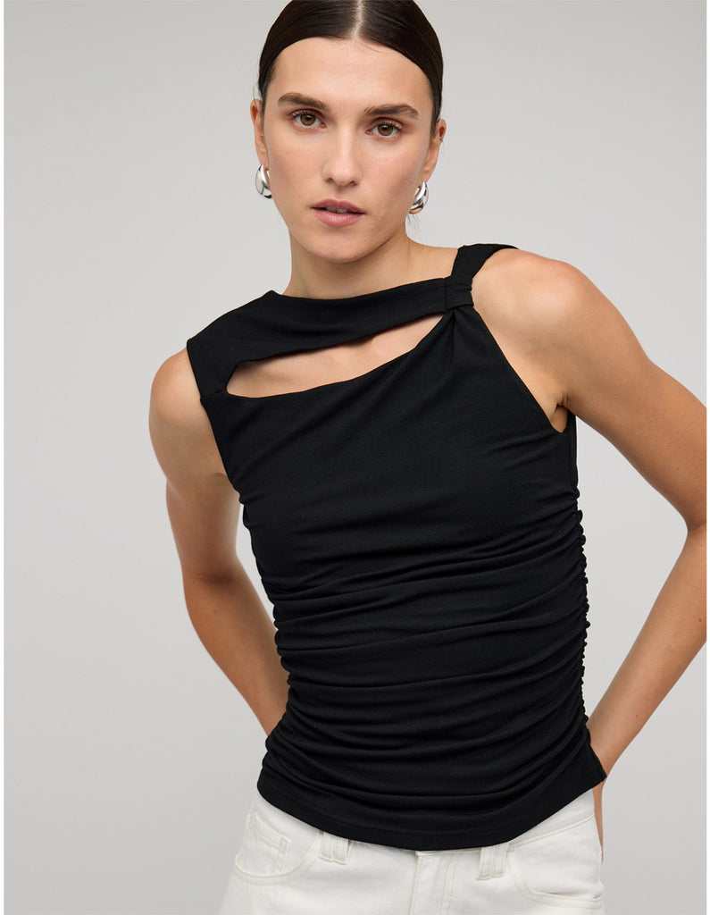The Mira Top is an elevated staple with a modern twist. Crafted from a soft and stretchy blend of 92% compact siro viscose and 8% elastane, it features a statement asymmetrical neckline with cut-out detail and flattering ruched sides for a body-skimming fit. Perfect for pairing with tailored pants, denim, or a sleek skirt for day-to-night styling.
