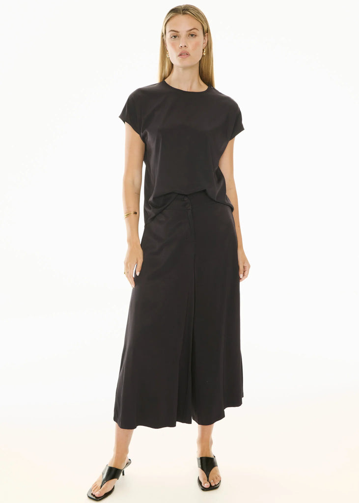 Designed in fluid viscose satin, the Rune Tee reinvents the classic tee with a sleek silhouette and a statement button detail at the left shoulder.